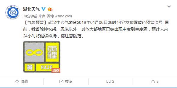【氣象預警】武漢中心氣象臺2019年01月06日08時44分發布霾黃色預警信號: 目前,我省除神農架、恩施以外,其他大部地區已經出現中度到重度霾,預計未來24小時將繼續維持,請注意防范。