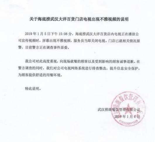 6日下午1時,海底撈火鍋就此事發布說明。說明稱,1月5日下午15:08分,海底撈武漢大洋百貨店內電視正在播放公司宣傳視頻時,屏幕出現不雅視頻,服務員當即關閉電視。門店已就相關情況報警,目前警方正在調查事件原委。