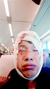 夏先生介紹,前日下午2時55分,他從武漢火車站乘坐D3265次動車,前往大冶辦事。列車出發約半小時后,快要行駛到黃石北站時,夏先生的頭部突然被一個重物砸中,回過神后,他確認砸中自己的是一個放在頭頂行李架上的大行李箱。他感覺頭部很痛,一摸頭頂滿手都是血。