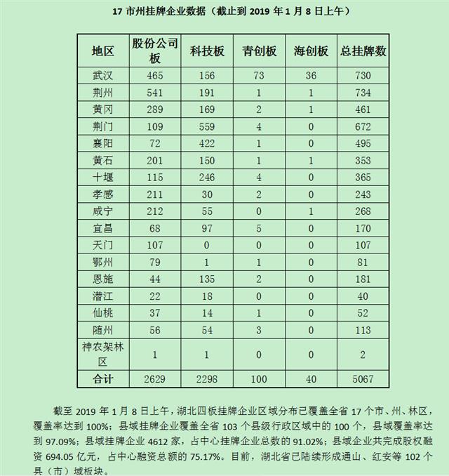 湖北四板市場(chǎng)正逐漸成為全國(guó)區(qū)域股權(quán)市場(chǎng)的排頭兵。截至目前,湖北四板掛牌企業(yè)5067家中“股份公司板”2629家,“科技板”2298家,“青創(chuàng)板”100家,“海創(chuàng)板”40家,393家企業(yè)實(shí)現(xiàn)融資總額923.27億元;托管、掛牌、交易、融資、特色板塊等主要業(yè)務(wù)指標(biāo),在全國(guó)34家區(qū)域性股權(quán)市場(chǎng)已躍居前列。