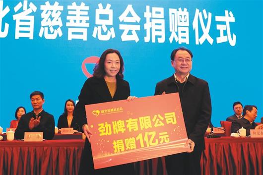 會上,勁牌有限公司、武漢當代科技產業集團股份有限公司等9家愛心企業現場捐贈款物2.418億元。