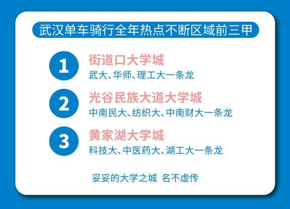而作為大學之城的武漢,單車騎行全年熱點不斷區域前三甲分別是:第一名:街道口大學城,武大、華師、理工大一條龍。第二名:光谷民族大道大學城,中南民大、紡織大、中南財大一條龍。第三名:黃家湖大學城,科技大、中醫藥大、湖工大一條龍。