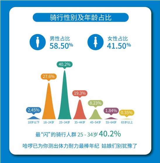100位騎行哈啰單車的用戶中,男性用戶比例占58.5%,女性用戶比例占41.5%。25歲至34歲的用戶最愛騎行,這個年齡段的用戶約為總數的40.2%。最長單次騎行時長是2小時33分,最遠騎行距離是24公里,相當于繞武漢內環線騎行一整圈。