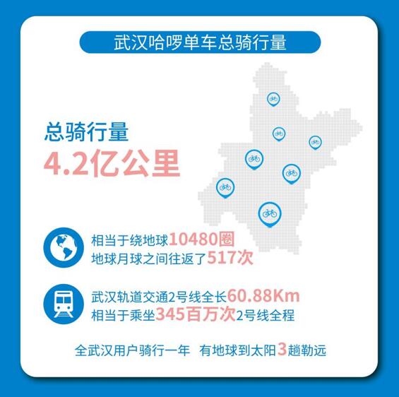 據哈啰單車大數據顯示,2018年,哈啰單車武漢騎行總量4.2億公里,相當于繞地球10480圈,地球月球之間往返517趟。武漢2號軌道交通一號線全長60.88公里,相當于乘坐345百萬次2號線全程。全武漢用戶騎行一年,正好是從地球到太陽距離的3倍。