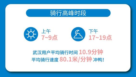 累積減少碳排放量5.3萬噸,相當于296萬棵樹吸收的碳排放量,是馬鞍山森林公園理論植被樹木的8倍。武漢用戶騎行共享單車的高峰時段分別是上午7點到9點,以及下午的17點到19點,平均騎行時間為平均騎行時間10.9分鐘,平均騎行速度為80.1米/分鐘。
