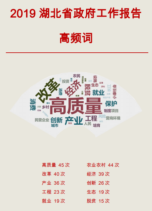 楚天輿情數據研究院通過對省政府工作報告全文進行詞頻分析,遴選出十大高頻詞。這些高頻詞透露了2019年的工作重點,相關領域同時也是媒體和網友關注的熱點。