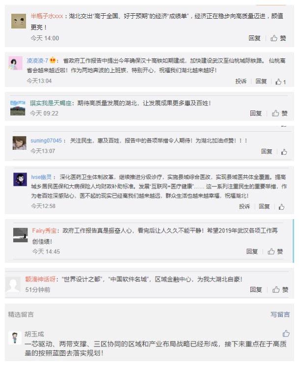 荊楚網客戶端-荊楚網消息(記者盧霜 顧偉華)1月14日上午,湖北省第十三屆人大二次會議在漢召開,省長王曉東作政府工作報告,引發輿論強烈反響。網民表示“報告中的各項舉措令人期待!”還有網民在荊楚網客戶端留言表示,“看完政府工作報告,底氣十足!傾聽百姓呼聲,聚焦民生熱點。祝福我們湖北越來越好!”