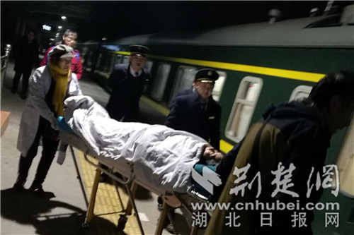 黃石站副站長黃征子獲悉后立即組織張金海、熊平春、趙偉華做好救助準(zhǔn)備,并在綠色通道門口等候。23時(shí)20分,何躍先隨車到達(dá)黃石站,黃征子及張金海、熊平春、趙偉華立即協(xié)助家屬將躺在擔(dān)架上的老人托舉著抬下救護(hù)車,送到一站臺(tái)7號(hào)車廂處等候。