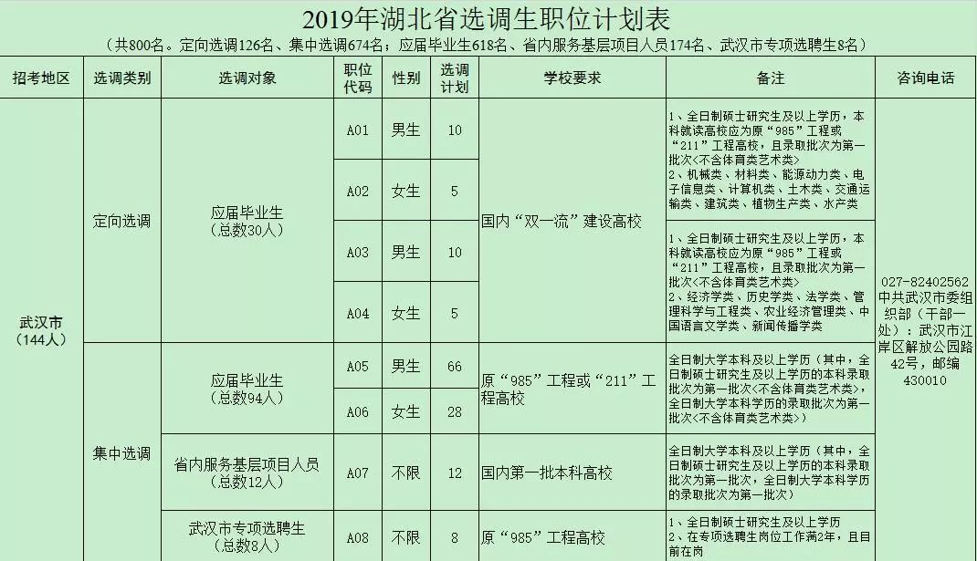 具體情況詳見湖北人事考試網《2019年湖北省選調生職位計劃表》。
