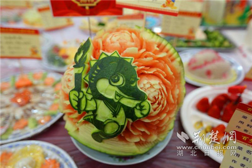 家住百步亭文卉苑的劉祉芮是一名大一新生,雖然才18歲,但她已參加過(guò)多次萬(wàn)家宴。萬(wàn)家宴來(lái)臨,她通過(guò)半個(gè)月的構(gòu)思和策劃,與家人一起用南瓜、冬瓜、蘿卜等多種原料,做出了"喜迎軍運(yùn)會(huì) 當(dāng)好東道主"的菜肴。冬瓜雕成的軍運(yùn)會(huì)吉祥物兵兵活靈活現(xiàn),她別出心裁的在南瓜上雕出"迎軍運(yùn)講文明樹新風(fēng)"的標(biāo)語(yǔ),"世界軍運(yùn)會(huì)將在武漢舉行,作為一名武漢人我們應(yīng)從自我做起,從身邊點(diǎn)滴小事做起,認(rèn)真踐行軍運(yùn)會(huì)東道主文明公約,做文明有禮武漢人。"劉祉芮說(shuō)。
