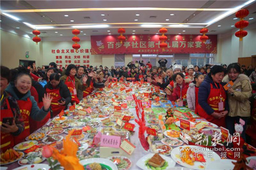 荊楚網(wǎng)客戶端—荊楚網(wǎng)訊(記者譚明猛 通訊員史雅琴、李?yuàn)櫋⑿苕肌撬肌?冷亞威、唐磊 )萬(wàn)家宴,萬(wàn)民歡,紅紅火火過(guò)大年。1月29日正是農(nóng)歷小年,百步亭社區(qū)第十九屆"唱響新時(shí)代 夢(mèng)圓中國(guó)夢(mèng)"萬(wàn)家宴熱鬧開席。社區(qū)居民端出自創(chuàng)的13866道菜品,擺滿黨群活動(dòng)中心主會(huì)場(chǎng)和9個(gè)分會(huì)場(chǎng),4萬(wàn)多個(gè)家庭歡聚一堂,吃團(tuán)年飯、過(guò)文化年,說(shuō)幸福生活。