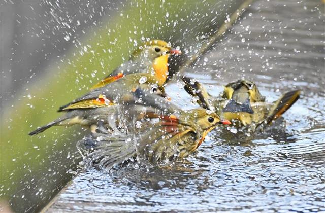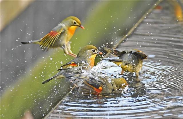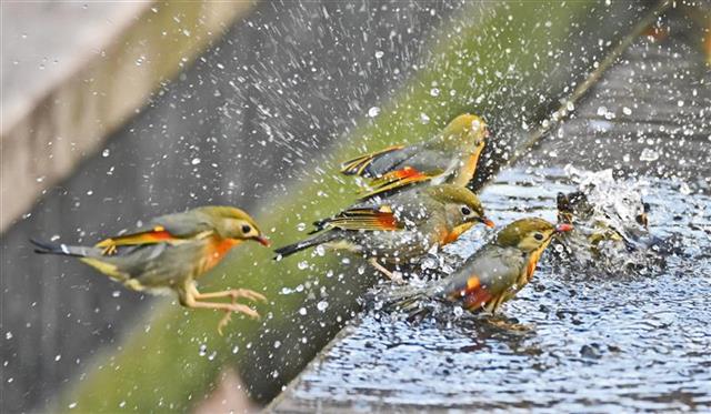 2月5日,立春后天氣開始回暖,湖北省宜昌市西陵區東湖一路一處社區綠化帶水池邊,成群的紅嘴相思鳥來此洗澡嬉戲,不少正在春節假期的市民來此觀賞“相思鳥戲春水”景觀。
