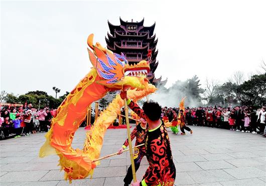 圖為:2月6日,武漢黃鶴樓公園游人如織,舞龍燈、耍獅子、猜燈謎,傳統民俗文化活動熱鬧非凡。
