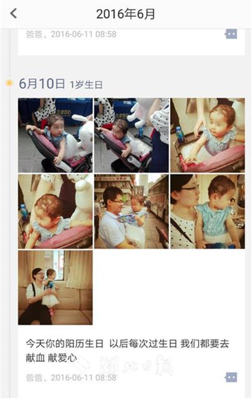 “第一次獻血是在2016年6月10日,那天是我女兒1歲生日,正好哺乳期滿了一年,符合獻血條件了,我就和先生一起抱著女兒去獻血站。我先生是外科醫生,他在讀大學時就開始獻血,很支持我的想法?!睆垥韵夹χ榻B。