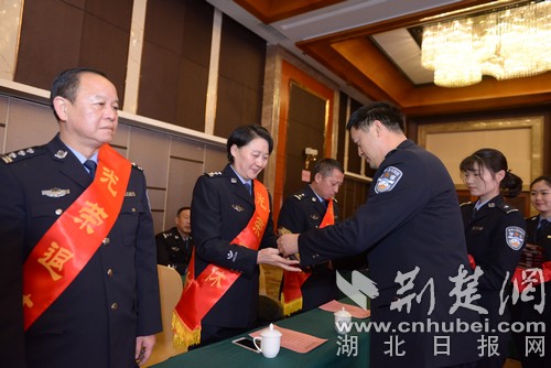 咸寧市副市長、市公安局局長肖天樹為退休民警頒發紀念章。(通訊員 張恒 攝)