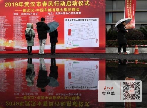 2月15日,武漢持續陰雨天氣,求職者頂風冒雨求職。記者李子云 攝