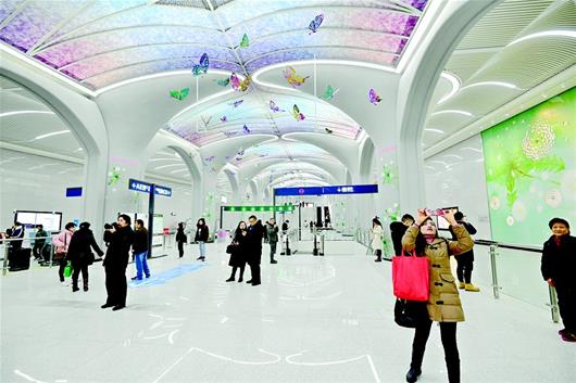 圖為昨日,眾多乘客在地鐵2號線南延線珞雄路站等特色站拍照留念