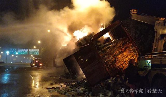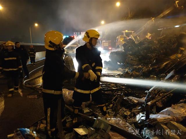 2月27日凌晨1時6分,氣溫接近冰點,寒冷有雨,位于三環線往姑嫂樹立交方向的高速公路上有掛車起火。武漢消防救援支隊119作戰指揮中心接警后,立即調派楊汊湖消防中隊3臺消防車、18名消防員趕赴現場處置?,F場,只見一輛車牌號為“贛F6**A掛”的掛車起火,車輛滿載貨物,火勢迅猛,當事司機十分焦急。楊汊湖消防中隊迅速組織2支水槍滅火,并做好現場警戒,同時呼叫增援供水。公安交警以及道路清障車也趕至現場處置。凌晨1時40分火勢得到控制。