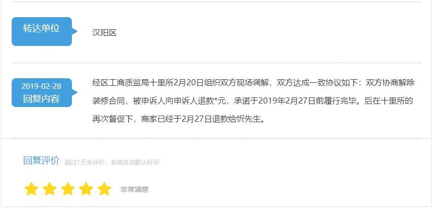 2月27日下午,武漢市漢陽區網群部聯系荊楚網《荊楚問政》欄目組,成功認領了“武漢市漢陽區”的平臺賬號。次日上午8時38分,就網友提出的“某裝飾公司不誠信問題”進行了回復,該網友看到回復后,給予了“五顆星”評價。“漢陽區”成為首家在《荊楚問政》認領賬號、回復留言、獲“五星好評”的單位。