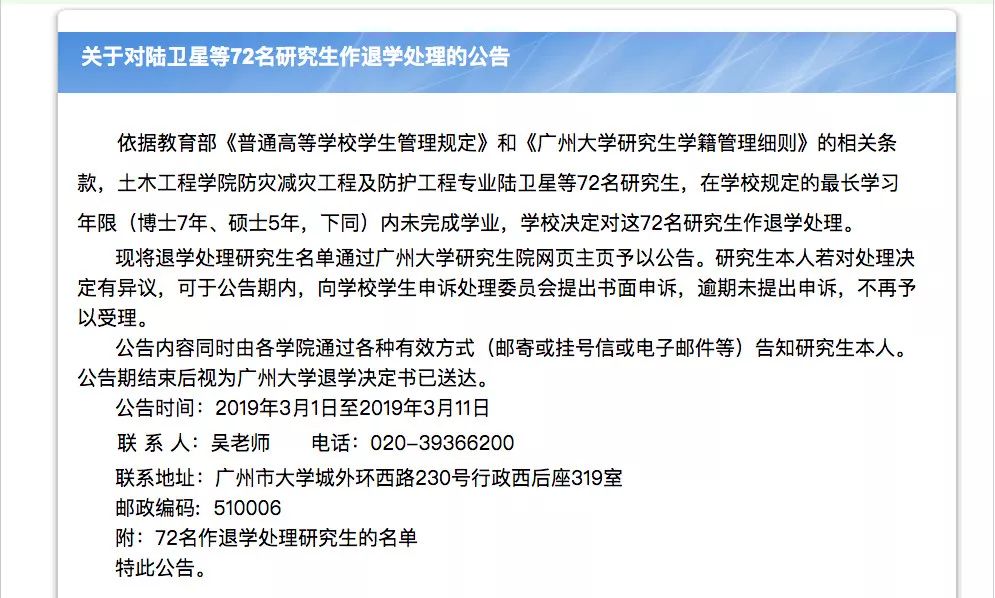 72名研究生在學校規(guī)定的最長學習年限(博士7年、碩士5年,下同)內未完成學業(yè),學校決定對這72名研究生作退學處理。