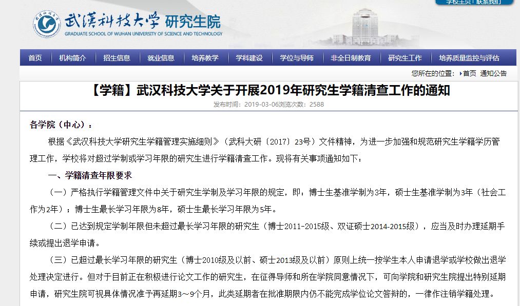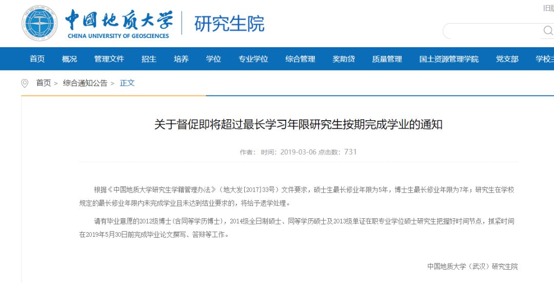 對于“超出最長學習年限且未提出結業(yè)申請”的2012級博士研究生(含留學生)和2014級碩士研究生(含留學生),擬按學校相關規(guī)定的要求進行退學處理。