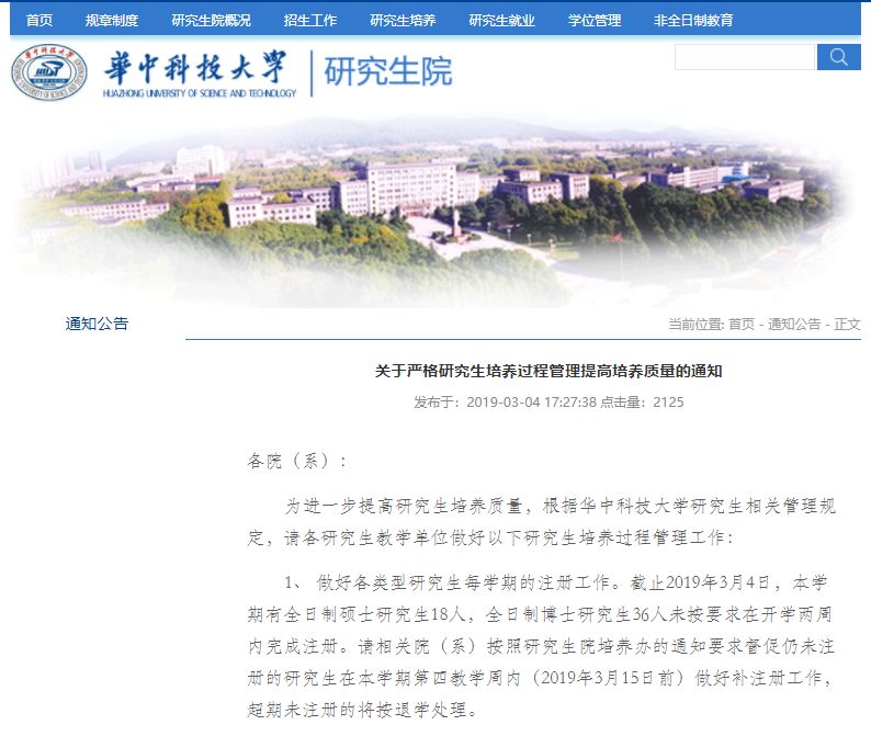 截止2019年3月4日,本學期有全日制碩士研究生18人,全日制博士研究生36人未按要求在開學兩周內完成注冊。本學期第四教學周內(2019年3月15日前)仍未補注冊的研究生將按退學處理。