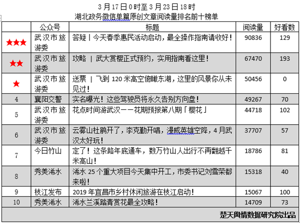 單篇原創(chuàng)文章排名方面,“武漢市旅游委”占據(jù)榜單前3名,并且有5篇文章進(jìn)入前十。