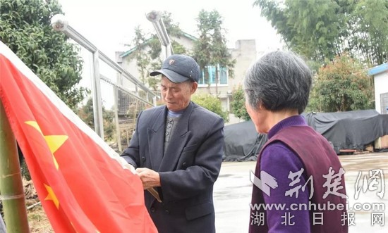 荊楚網(wǎng)客戶端-荊楚網(wǎng)消息(通訊員肖永軍、胡慶華)“起來,不愿做奴隸的人們……”伴隨手機(jī)播放的國歌聲,一位古稀老人利用自制的旗桿,熟練地將國旗緩緩升向空中,家人靜立一旁深情注視……2008年至今,每逢重大節(jié)慶日,這樣的升旗儀式都會在松滋洈水鎮(zhèn)蔣家沖村3組的一個農(nóng)家小院上演。