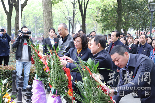 上午9點30分,活動正式開始,全體人員佩戴黨徽,肅立奏唱《中華人民共和國國歌》,武漢革命博物館館長高萬娥宣讀祭文。隨后,舉行向革命烈士敬獻花籃儀式,武漢革命博物館館長高萬娥、書記單宏均,武昌區文化和旅游局局長、黨組書記葛文凱,中華路街黨工委書記夏家新、辦事處主任鄭肖凡上前整理緞帶。全體人員行三鞠躬禮,集體瞻仰十大監委群雕,并向烈士敬獻菊花。