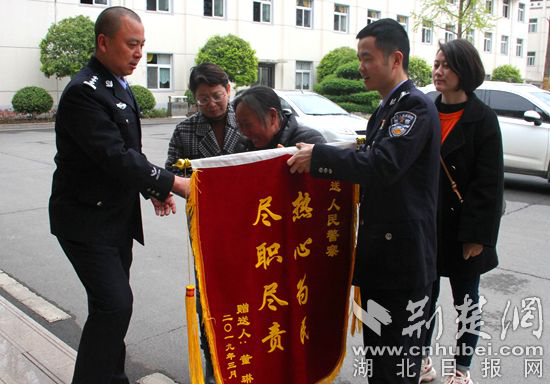 荊楚網客戶端—荊楚網消息(通訊員關洪莉)“就是他!就是他!我認得到他!終于找到啦!”4月3日上午,家住荊門市沙洋監獄二農場60多歲的陳阿姨在女兒的攙扶下,來到江漢油田公安局,將一面印有“熱心為民 盡職盡責”字樣的錦旗送到了嚴慶華的手中。老人喜極而泣,緊緊地抓住他的手,“你就是我們家的恩人!”