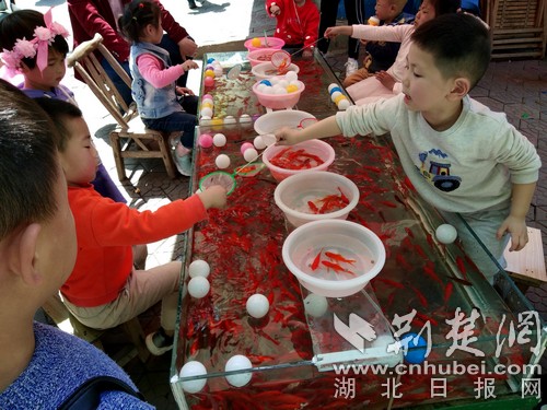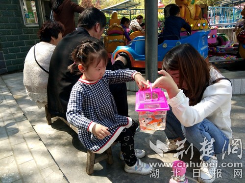 小游客喂食小金魚。(通訊員 張云朝 攝)