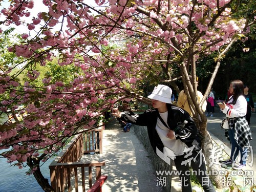 美女探身拍櫻花。(通訊員 張云朝 攝)