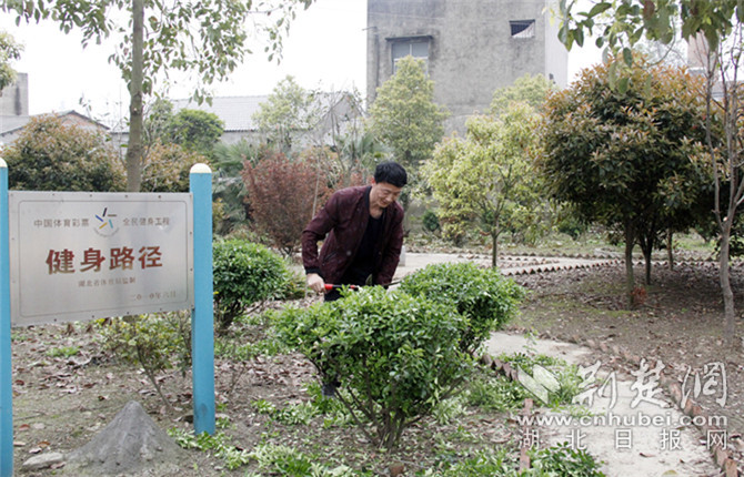 鄢溝村村民義務為游園內的綠植剪枝。攝影 通訊員 陳芬