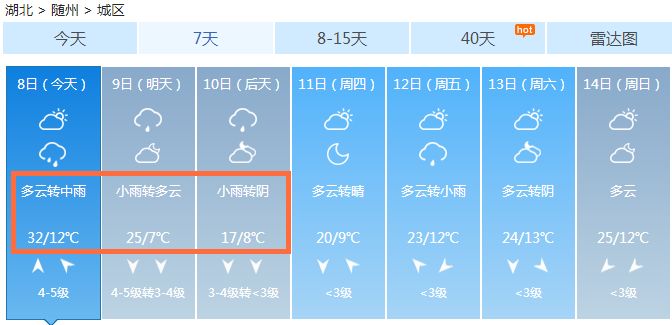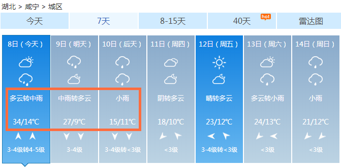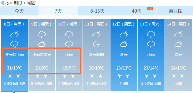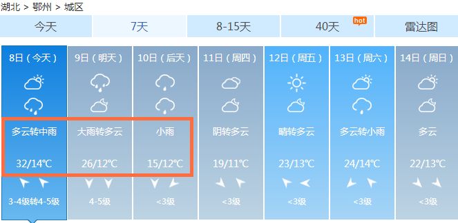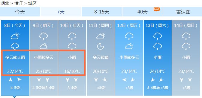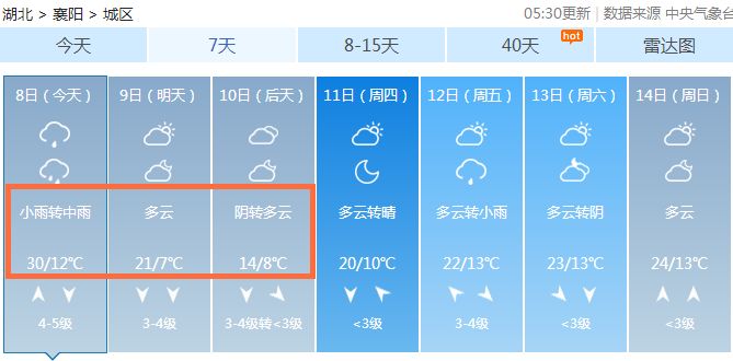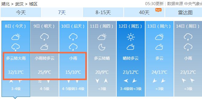 今天夜間至明天上午,中東部有 分散性中到大雨、局部暴雨,西部以小到中雨為主,省內(nèi)局部有雷暴大風(fēng)、冰雹等強(qiáng)對流天氣, 最大小時雨強(qiáng)可達(dá)20-30毫米, (1小時降雨就達(dá)到一天中到大雨的雨量); 周二下午雨水暫停; 周三繼續(xù)雨掃全省,除鄂西南雨勢較大,為小到中雨外,其他地區(qū)小雨。