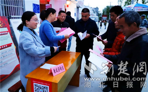 扶貧干部在設置的扶貧政策和廉政咨詢臺前,發放扶貧政策宣傳單。雋宣 攝