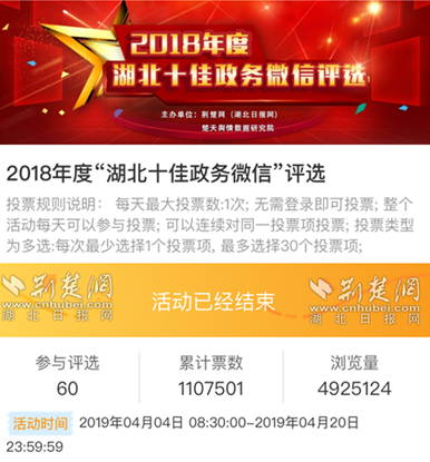 3月26日,2018年度湖北十佳政務微信評選活動發起報名;4月4日,網絡投票正式啟動;參與投票的省直、市州、縣區系統各20家微信公眾號,多有積極組織投票者,截至20日24時,省直系統排名前三的票數是69389、68450、62929,市州系統排名前三的票數是69023、48200、26812,縣區系統排名前三的票數是94374、82271、67078。