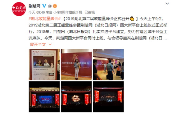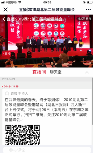 當天9時,2019湖北第二屆政能量峰會暨荊楚網(湖北日報網)四大新平臺上線儀式正式啟動,荊楚網客戶端、PC端、微博、荊楚網(湖北日報網)斗魚直播間同步視頻圖文直播,各直播平臺網友與主播互動頻繁。