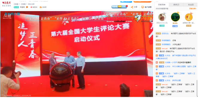“武漢設計工程學院發來賀電”……第六屆全國大學生評論大賽正式啟動,一大批參加過好幾屆評論大賽的大學生們,在直播間里紛紛發來祝賀。評論大賽主題詞——“追夢人,正青春”,瞬間刷屏,更多的網友為評論大賽、為荊楚網送上祝福:“祝福荊楚網影響力紅紅火火,新媒體發展蒸蒸日上。”