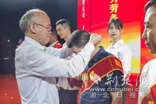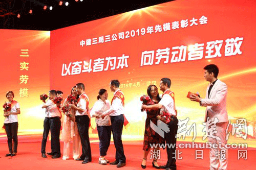 在葛店完全中學的建設工地上,中建三局三公司特意為奮戰在施工一線的農民工朋友組織的一場“工地好聲音,致敬勞動者”的頒獎大會,10名平日與鋼筋混凝土、模板腳手架打交道的工友,掛上勛章、手棒鮮花坐在C位,和他們的父母妻兒一起享受到了勞動者的榮光。