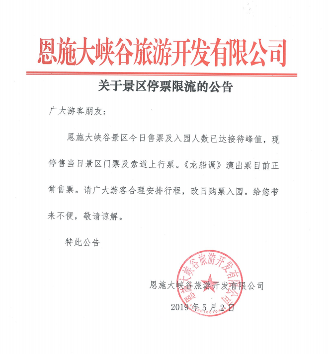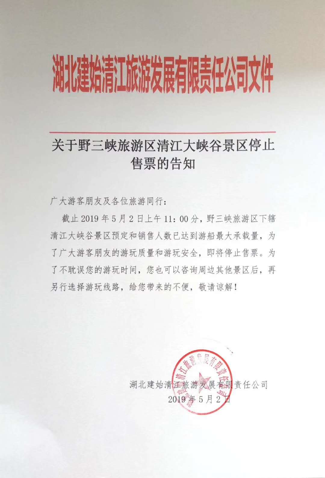 5月2日上午11時,由于景區預訂和銷售人數已經達到最大承載量,恩施野三峽清江大峽谷景區宣布停止售票。