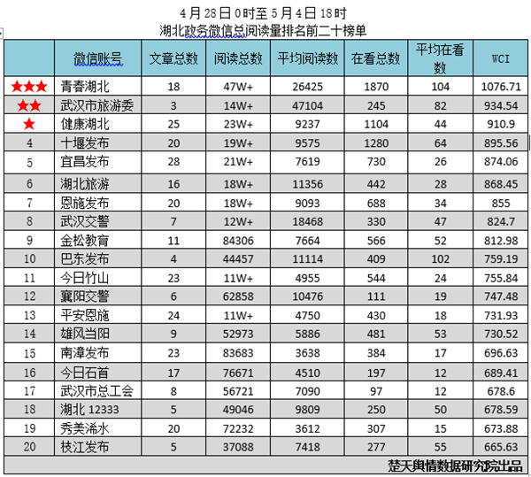 3、樣本范圍和數(shù)量每周會根據(jù)實(shí)際情況進(jìn)行微調(diào)。目前,納入統(tǒng)計(jì)的公眾號樣本有1276個,還在不斷擴(kuò)大中。歡迎湖北省內(nèi)政務(wù)微信的運(yùn)營部門或負(fù)責(zé)人毛遂自薦,加入排行榜(聯(lián)系電話:027-88567710)。