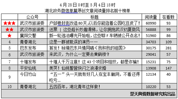單篇原創(chuàng)文章排名方面,“武漢市旅游委”包攬第1、第2、第6名。“襄陽交警”成為黑馬,奪得第3名。