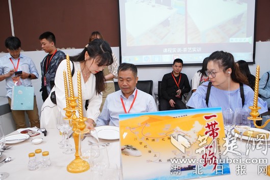 以“一帶一路”“軍運會”為主題,分別榮獲高職組一、二等獎的中西式宴會服務作品陳列在國際郵輪與乘務管理專業的中西餐實訓室。作為此次學校講解員,該校就業處副處長萬婷介紹,以金色為主題,為了“一帶一路”相呼應,學生還自己動手將調味瓶進行噴漆處理,達到契合。