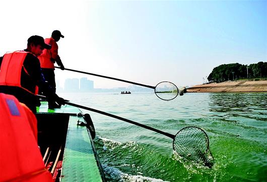 圖為:5月10日,漢江晴川橋附近水域,水上清漂隊在作業。(湖北日報全媒記者倪娜通訊員陳瀅攝)