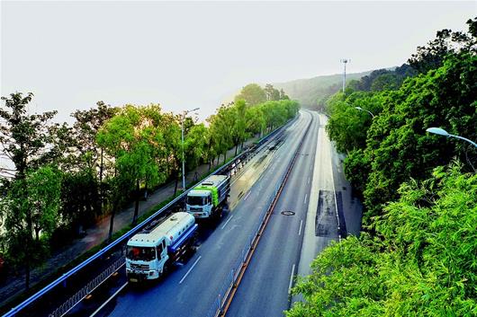 圖為:5月10日清晨5點30分,灑水車和清掃車在南湖大道進行梯形作業。(湖北日報全媒記者倪娜通訊員劉洪凱攝)
