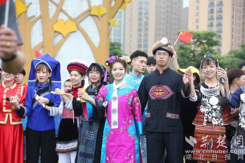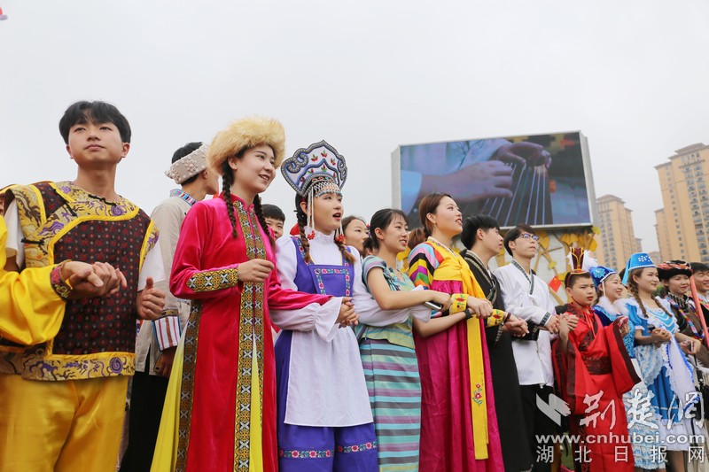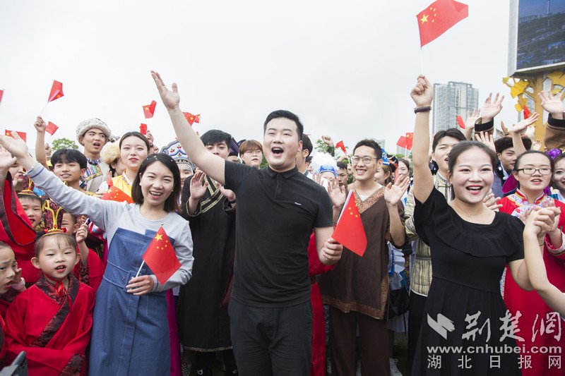 “五星紅旗迎風(fēng)飄揚(yáng)……”,當(dāng)現(xiàn)場(chǎng)響起天籟童聲時(shí),由小學(xué)生、教師、創(chuàng)業(yè)青年代表和中南民族大學(xué)56個(gè)民族的大學(xué)生領(lǐng)唱的串燒歌曲吸引了四周的市民。在現(xiàn)場(chǎng)氛圍的感染下,現(xiàn)場(chǎng)嘉賓、軍人代表、運(yùn)動(dòng)員代表、留學(xué)生以及來(lái)自江漢大學(xué)、武漢船舶職業(yè)技術(shù)學(xué)院、武漢商學(xué)院、湖北交通職業(yè)技術(shù)學(xué)院的260余名志愿者揮舞著國(guó)旗,一同參與了《歌唱祖國(guó)》《不忘初心》《我愛(ài)你中國(guó)》《我和我的祖國(guó)》的歌曲串燒“快閃”。