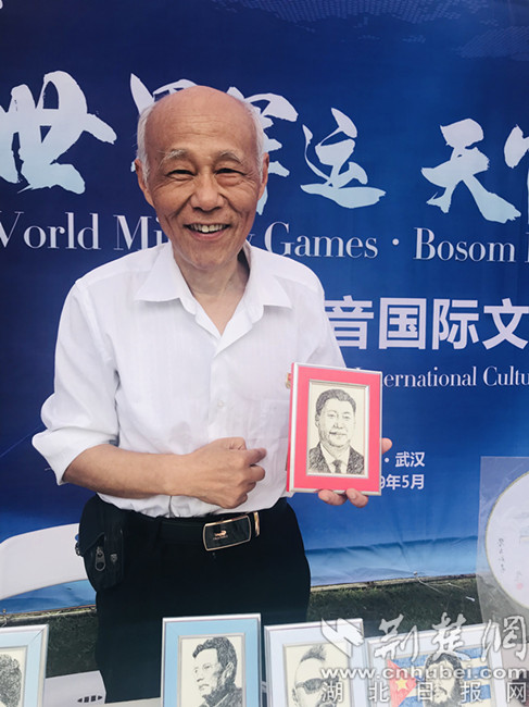 71歲畫扇師傅身邊圍滿了觀眾,創作畫扇的陳伍金畢業于湖北美校,當過工人、老師、宣傳干事,斷斷續續畫扇長達50余年,他將牡丹,古琴等傳統文化元素融入畫中,賦予每幅畫扇獨特的寓意,如今制作一副栩栩如生的畫扇從調墨到勾勒再上色只需要十多分鐘。對軍運會和知音文化他表達了自己的感想:"知音就是理解,無論是上下級、夫妻還是兄弟之間都需要理解。"他認為此次活動將知音文化與軍運融合,不僅代表著民族文化的高度,還代表整個人類文化的高度。