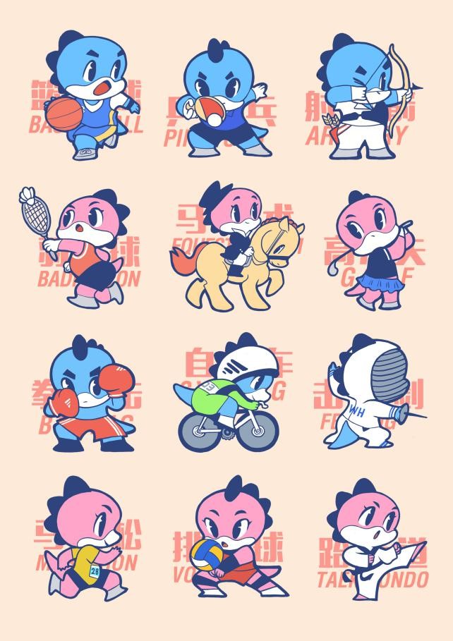 以藍色的兵兵和粉色的女版兵兵為原型,以各類比賽項目為基礎,創作了一組卡通形象,活潑可愛、積極向上,富有朝氣與現代感,可用于鑰匙扣、筆記本、膠帶、文件夾、卡套、貼紙、手機殼等文化創意產品。