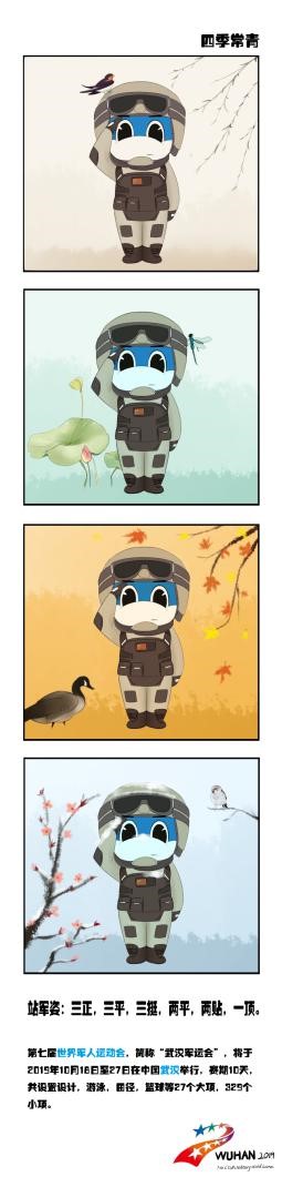 以2019年第七屆世界軍人運動會吉祥物-"兵兵"為主體來設計的軍人兵兵。表達軍人一年四季站在崗哨上,體現了軍人的毅力和耐心。不管是冬天的冰天雪地還是夏天的烈日炎炎,哪怕是下雨下冰雹,軍人同樣都要堅守在自己的崗位上,對于這些站崗的軍人們,我們應該對他們足夠的尊重和敬意。