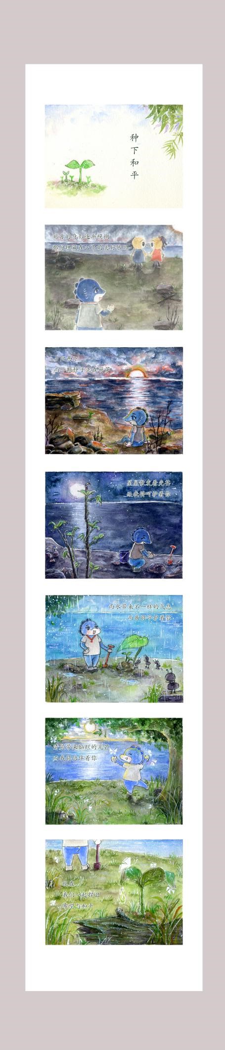 本作品圍繞"共享友誼、同筑和平"的共同心聲為主題創作一副條漫作品,關注一棵代表和平的小樹苗在交接給中國,并通過兵兵呵護正在茁壯成長,寓意著東道主筑世界和平,突出了軍人的和平使命和美好愿景。